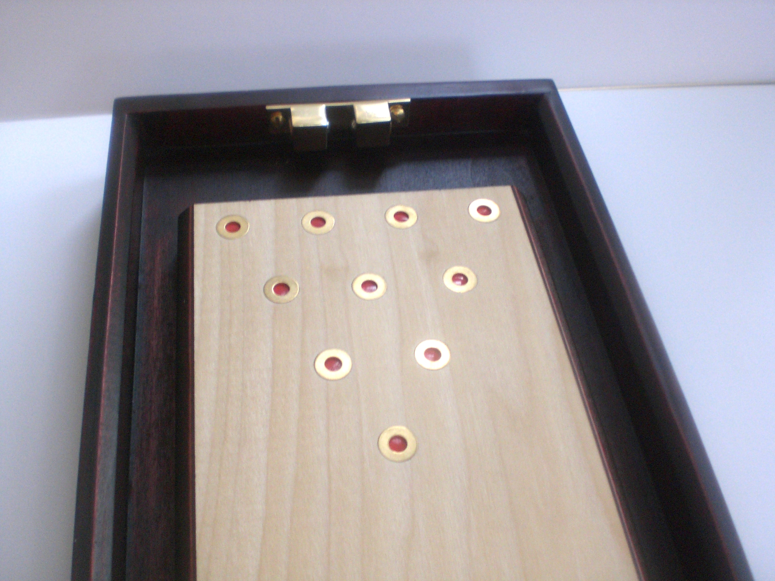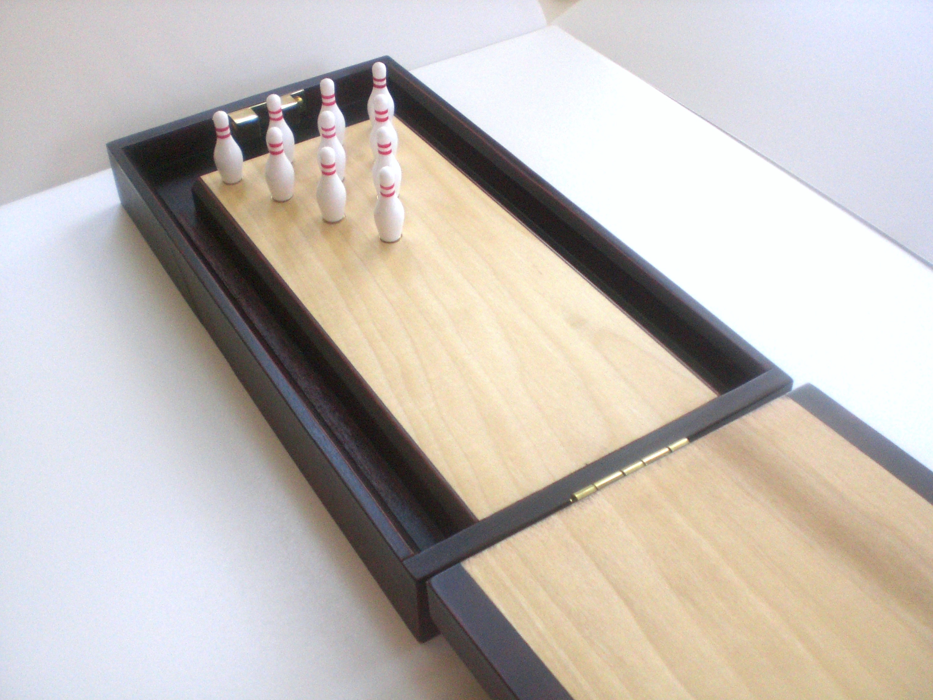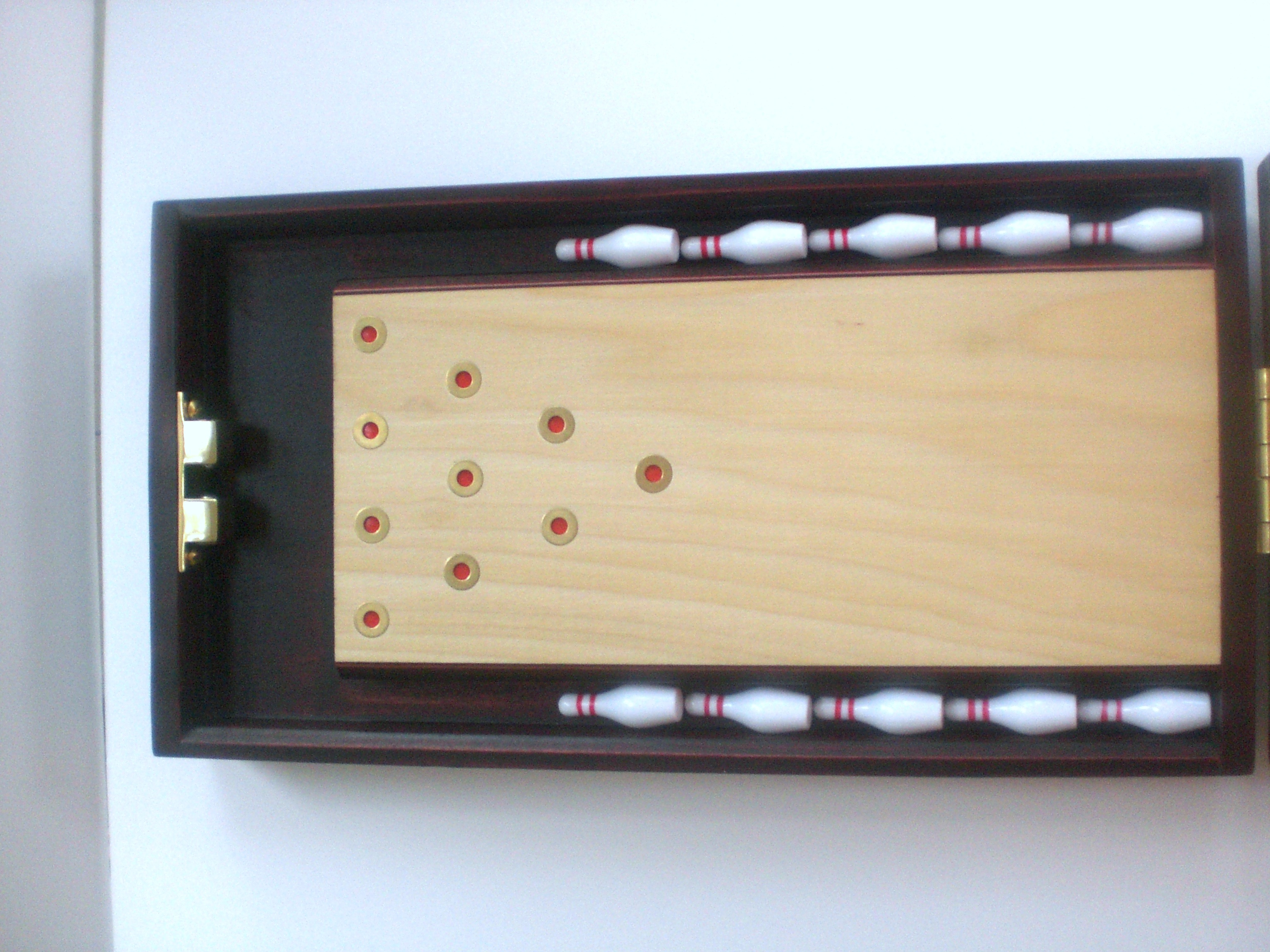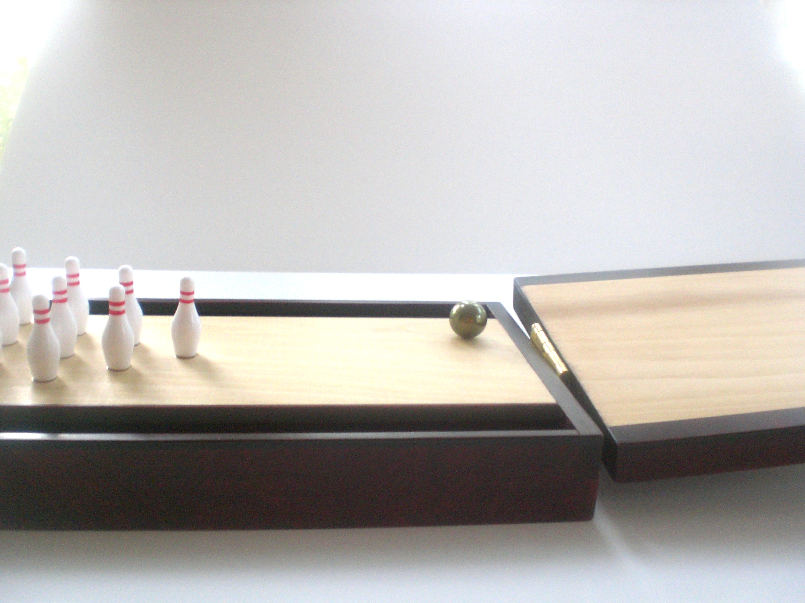 Voted the best TableTop Bowling game for it's beauty and it's unique challenging fun. This is one game you will leave out on the table for display. Handmade from hardwood with a rich bombay mahagony finish, and adorned with solid Italian brass.